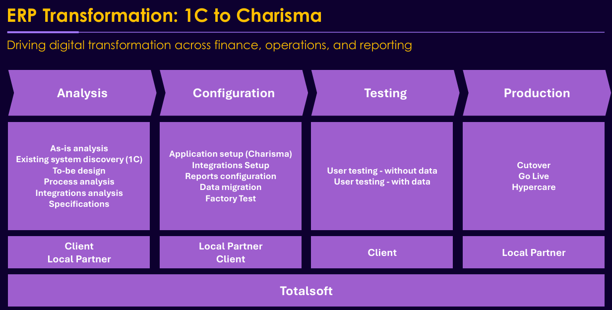 TotalSoft, prin partenerul său local NetSafe, asigură implementarea și suportul post-implementare. „Venim nu doar cu soluții, ci și cu un plan de investiții care vizează inclusiv dezvoltarea industriei locale”, a menționat Daniel Nedelcu, menționând că Republica Moldova este una dintre piețele strategice de extindere pentru TotalSoft, abordată prin partenerul local de distribuție NetSafe care asigură atât controlul calității, prin echipe de ingineri locali, cât și gestionarea relației cu clienții. Totodată, TotalSoft își propune să lucreze cu partenerii locali pentru livrarea serviciilor de implementare și post-implementare.