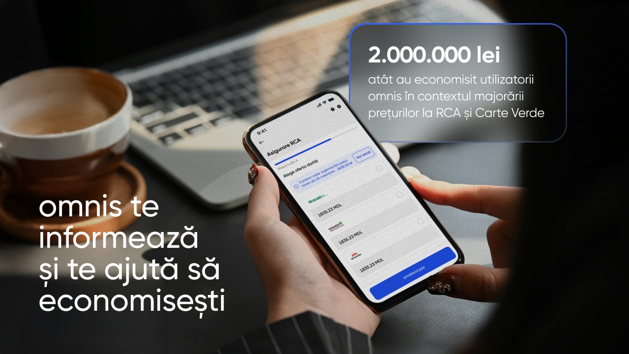Omnis este prima aplicație de asigurări din Moldova, care oferă utilizatorilor posibilitatea de a perfecta rapid și sigur polițe RCA, Carte Verde, CASCO, asigurarea de accidente, asigurarea medicală de călătorie, rovinieta și vinieta Bulgară, dar și achitarea taxei de drum. Asigurările sunt păstrate în format digital direct în cabinetul online și sunt mereu la îndemână.