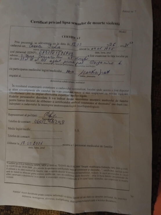 Comisarul principal Ion Tîltu de la Inspectoratul de Poliție Florești ne-a răspuns că la 18 martie 2026 a fost înregistrat un proces penal pe faptul decesului cetățeanului Tudor Cazacu la 17 martie 2026. „În prezent se efectuează acțiuni de urmărire penală în cadrul procesului penal în vederea stabilirii tuturor circumstanțelor cazului dat, inclusiv a fost dispusă efectuarea expertizei medico-legale în privința cadavrului cet. Cazacu Tudor. Deocamdată, raportul de expertiză judiciară medico-legală nu a parvenit”, ne-a comunicat comisarul principal de la Florești.