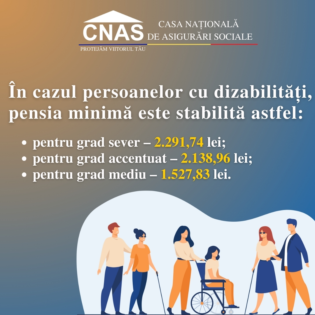 „Sistemul public de asigurări sociale funcţionează pe baza unor principii clar definite, printre care principiul egalităţii, care asigură tuturor participanţilor la sistemul public, contribuabili şi beneficiari, un tratament nediscriminatoriu privind drepturile şi obligaţiile prevăzute de lege, principiul obligativităţii, potrivit căruia persoanele fizice şi juridice au obligaţia de a participa la sistemul public şi principiul contributivităţii, conform căruia drepturile de asigurări sociale se cuvin pe temeiul contribuţiilor de asigurări sociale plătite. Conform Legii nr. 156/1998 privind sistemul public de pensii, pensia calculată este un drept bănesc, stabilit în funcție de contribuțiile achitate în bugetul asigurărilor sociale de stat și de durata stagiului de cotizare, reexaminat, majorat și indexat. Conform aceleiași legi, dizabilitatea şi capacitatea de muncă, cauzele, gradul şi timpul survenirii acestora se constată de către Consiliul Naţional pentru Determinarea Dizabilităţii şi Capacităţii de Muncă (CNDDCM). Pentru a beneficia de o pensie de dizabilitate, asiguratul încadrat într-un grad de dizabilitate accentuată sau medie, cauzată de o afecțiune generală, beneficiază de o pensie de dizabilitate dacă îndeplineşte condiţiile de stagiu de cotizare în raport cu vârsta la data constatării dizabilității. Cuantumul pensiei de dizabilitate se calculează din venitul realizat de persoană în raport cu gradul de dizabilitate la data depunerii cererii pentru stabilirea pensiei de dizabilitate. În cazul în care cuantumul pensiei calculate este mai mic decât pensia minimă stabilită de Guvern, persoanei i se acordă pensia minimă. Pensia de dizabilitate se stabileşte pe perioada cât durează dizabilitatea confirmată de CNDDCM.