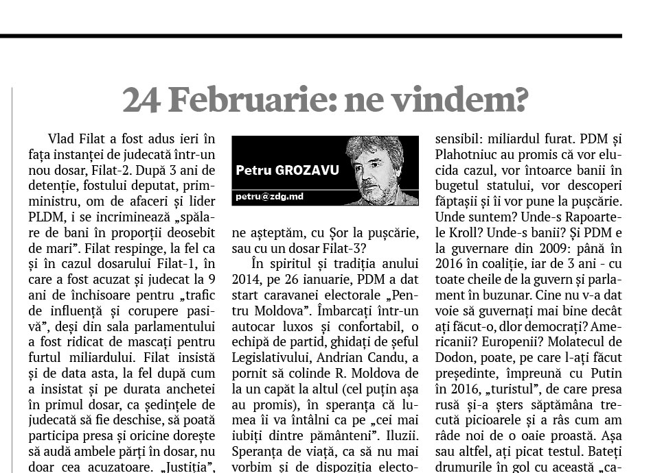 Vlad Filat a fost adus ieri în faţa instanţei de judecată într-un nou dosar, Filat-2. După 3 ani de detenţie, fostului deputat, prim-ministru, om de afaceri şi lider PLDM, i se incriminează „spălare de bani în proporţii deosebit de mari”. Filat respinge, la fel ca şi în cazul dosarului Filat-1, în care a fost acuzat şi judecat la 9 ani de închisoare pentru „trafic de influenţă şi corupere pasivă”, deşi din sala parlamentului a fost ridicat de mascaţi pentru furtul miliardului. Filat insistă şi de data asta, la fel după cum a insistat şi pe durata anchetei în primul dosar, ca şedinţele de judecată să fie deschise, să poată participa presa şi oricine doreşte să audă ambele părţi în dosar, nu doar cea acuzatoare. „Justiţia”, însă, se opune. De ce? Pentru că nu asta e scenariul. Filat nu pentru asta este scos din camera de închisoare şi purtat prin faţa presei la proces şi de la proces, ca un urs dintr-un circ ambulant. Filat trebuie scos din cameră, arătat presei, filmat, după care arătat şi cu degetul că, uite, iată-l, vedeţi-l, nu-l uitaţi, amintiţi-vi-l că el este marele vinovat de tot ce s-a furat în R. Moldova şi hoţul prins „de noi”, adică de Plahotniuc şi de anturajul său. Filat este folosit de PDM pe post de carte de joc (bulă) electorală. „Democraţii” încearcă să se spele pe mâini de dosarul miliardului furat cu acelaşi „săpun” cu care s-au mai spălat, pentru că aşa le convine. Da, mai există şi un Veaceslav Platon. Atât. Unde-s Rapoartele Kroll? Plahotniuc nu vrea să le deschidă pentru public pentru că acolo e plin de nume care îl slujesc. Şi atunci se acoperă, electoral, fie cu Filat, fie cu Platon. Sunt departe de gândul că Platon ori Filat ar fi sfinţi, dar locurile în care stau ei demult rămân în aşteptarea şi altor foşti şi actuali miniştri, foşti şi actuali deputaţi, bancheri, prim-miniştri, procurori, judecători, securişti… Şi doi: nu mai poate fi V. Filat, dlor „democraţi”, cartea de coz cu care să va puteţi apăra în acuzaţiile de furtul miliardului. Nu mai prinde la lume. Fiţi mai inventivi. Deschideţi Kroll-2. Mai schimbaţi „caii”. Cu Filat şi Platon la închisoare şi cu Şor la libertate nu prea seamănă a dreptate. La ce să ne aşteptăm mai departe: cu Şor la puşcărie, sau cu un dosar Filat-3?