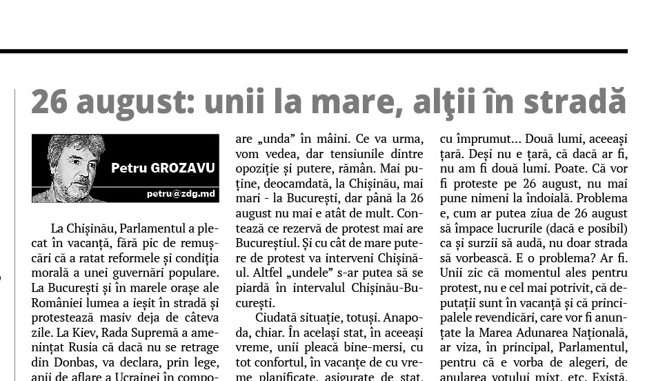 Ciudată situaţie, totuşi. Anapoda, chiar. În acelaşi stat, în aceeaşi vreme, unii pleacă bine-mersi, cu tot confortul, în vacanţe de cu vreme planificate, asigurate de stat, pleacă la băi, la munte, la saline, la mare, se bronzează la soare pe cele mai aurite nisipuri din lume, ori se prind captivaţi de largurile apelor de pe cele mai luxoase iahturi, în timp ce alţii se chinuie şi se gândesc, pe timp canicular, cum să împace lucrurile, să îşi croiască ceva timp, să lase casa şi tot ce are pe lângă casă pe o zi sau mai multe şi să iasă pe 26 august la proteste, să se manifeste, să arăte şi să le spună celor de la guvernare că nu DA şi PAS i-au scos în stradă, dar nevoile, viaţa, care nu mai este viaţă, speranţele care au ajuns la „0”, străinătatea de care s-au săturat, preţurile care îi jupoaie, facturile care îi dezbracă, pensiile care nu le ajung nici pentru înmormântare, salariile din care trebuie să trăieşti cu împrumut… Două lumi, aceeaşi ţară. Deşi nu e ţară, că dacă ar fi, nu am fi două lumi. Poate. Că vor fi proteste pe 26 august, nu mai pune nimeni la îndoială. Problema e, cum ar putea ziua de 26 august să împace lucrurile (dacă e posibil) ca şi surzii să audă, nu doar strada să vorbească. E o problema? Ar fi. Unii zic că momentul ales pentru protest, nu e cel mai potrivit, că deputaţii sunt în vacanţă şi că principalele revendicări, care vor fi anunţate la Marea Adunarea Naţională, ar viza, în principal, Parlamentul, pentru că e vorba de alegeri, de anularea votului mixt, etc. Există, însă, voci care zic că în situaţia în care toate în R. Moldova sunt sub controlul aceleiaşi persoane, V. Plahotniuc, nu contează unde sunt deputaţii, în vacanţă sau în sala de şedinţe. Oricum, nu ei decid. Ei doar votează. Nu asta ar fi, însă, cea mai mare problemă a protestelor. Cea mai mare problemă a protestelor e că ele, nu pot fi ţinute sub control întotdeauna de cei care le organizează. Sau, cei care le organizează, nu toţi sunt în acelaşi gând cu protestatarii. Şi atunci, unii protestează şi alţii profită. Avem exemplul Revoluţiei Române din 1989, avem, mai proaspăt, violenţele în care au degenerat protestele paşnice la Bucureşti în seara zilei de 10 august şi care rămân neidentificaţi, mai aproape de noi avem cazul violenţelor sălbatice, cu devastarea parlamentului, preşedinţiei şi „coridoarele morţii” în care au fost transformate manifestările paşnice din 6-7 aprilie 2009. Dacă vreţi, putem lua drept exemplu şi euromaidanul ucrainean din noiembrie 2013, care a degenerat, în mai puţin de două săptămâni, în război civil. Marea Adunare Naţională din 26 august, prin revendicările sale, nu trebuie să fie, pur şi simplu, o acţiune de protest, de care au mai fost. În condiţiile anului electoral 2019, ea trebuie să dea startul unei mişcări populare de masă care, fie că determină regimul să dea înapoi şi să revadă regulile jocului electoral (că asta contează în primul rând), fie provoacă boicotarea alegerilor parlamentare şi ridică Moldova la proteste generale, până nu obţine capitularea regimului. Iar pentru asta, Marea Adunare din 26 august trebuie să vină în faţa asistenţei cu un program clar de acţiune imediată pe ţară, cu un guvern de opoziţie (dar guvern, nu păpuşă) şi cu un Comitet de Rezistenţă Naţională, care să onoreze Mişcarea, nu s-o compromită. Altfel, degeaba scoatem lumea din casă.