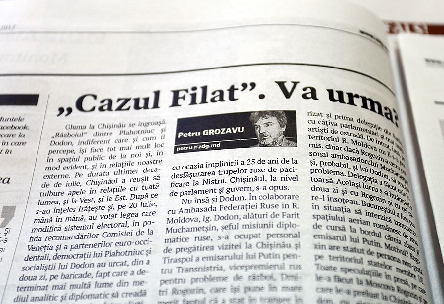 Acuzații tari la adresa României legate de „cazul Rogozin” (altfel cum?) a făcut, în mod evident, și Dodon. Înzecit, față de Rogozin. Dacă e să pupi, să se simtă… La rost a fost luată și America, și România. Dodon a amenințat Bucureștiul că nimic din ce s-a întâmplat cu Rogozin nu i se va ierta. „Va veni timpul”, a dat verdict „înțeleptul”. La patru zile după incident, Rogozin și-a retras toate acuzațiile la adresa României de pe rețelele de socializare, a catalogat cele întâmplate drept o „provocare”, pusă la cale, potrivit investigațiilor lor, de V. Plahotniuc, pentru „a dăuna relațiilor Rusiei cu România”. O fi sau nu, greu de spus. Ca și în cazul războiului Plahotniuc – Dodon. Faptul că „proeuropeanul” Plahotniuc a trecut, pe 20 iulie, pod peste vocea partenerilor occidentali și a ales să facă tranzacție cu pro-rusul Dodon în proiectul „votului mixt” pune foarte multe semne de întrebare dacă războiul dintre ei e război sau joc? Deocamdată, seamănă a fi mai degrabă joc. Dar nu e exclus să fie și război. S-ar putea ca după ce a profitat de votul lui Dodon pentru „votul mixt”, V. Plahotniuc să-și permită a fi cu el așa cum a fost cu oricine dintre posibilii adversari. „Cazul Filat” nu cred să existe într-un singur exemplar în „planurile” lui Plahotniuc.