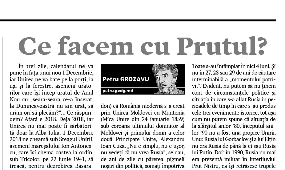 Suntem în an aniversar – 100 se împlinesc de la Marea Unire de la Alba Iulia din 1 Decembrie 1918 şi alţi 20 si ceva, aproape 30 de ani de la Prima Mare Adunare Naţională la Chişinău (27 August 1989) şi cam tot atâţia de la primul Pod de Flori (6 mai 1990), proclamarea Independenţei (27 August 1991) şi căderea cortinei de fier de pe Prut – ani în care ideea Unirii nu ne-a lipsit şi a fost prezentă în viaţa noastră în toate şi peste tot: în scoală, în politică, în educaţie, presă, spaţiul public, armată, poliţie, ştiinţă şi cercetare, administraţie publică, cultură, economie, dezvoltare teritorială, biserică… Mai puţin în diplomaţie, dar a fost şi aici. Ne-am schimbat? Am devenit alţii? Unde suntem? Cât de departe sau de aproape de Marele Ideal al Unirii şi al Marii Românii? Ne-am clarificat? Suntem gata, ori tot robi ai indeciziei, speculaţiilor şi rătăcirilor, prinşi între aceleaşi întrebări: ne unim – nu ne unim, face sau nu face, e timpul, nu e timpul, e momentul potrivit ori să mai aşteptăm, ca să vedem ce zice Rusia? Mi-amintesc, în acest context, de Alteţa Sa, regretatul Mihai al României, care, într-un interviu încă din anii exilului, remarca că „momentele potrivite” trebuiesc generate şi valorificate, pentru că altfel, „tot căutând sau aşteptând să vină momentul potrivit, riscăm să nu-l mai prindem nicicând”. E despre noi, nu? Suntem de aproape trei decenii în căutări – timp şi şanse berechet. Şi tot în căutări. De 30 de ani ne căutăm pe noi înşine şi nu ne putem găsi sau regăsi. De unde atâta rătăcire (dacă sunt rătăciri şi nu altceva, inclusiv analfabetism istoric)? Şi cât mai pot continua aceste rătăciri, şi cât ne mai putem întreba dacă Moldova e România, când ştim deja, de la mic la mare (cu excepţia celor care nu vor sau nu le convine din laşitate sau mancurtism, să ştie, gen Ig, Dodon) că România modernă s-a creat prin Unirea Moldovei cu Muntenia (Mica Unire din 24 ianuarie 1859) sub coroana ultimului domnitor al Moldovei şi primului domn a celor două Principate Unite, Alexandru Ioan Cuza. „Nu e simplu, nu e uşor, nu vedeţi că nu vrea Rusia”, se dau, de ani de zile cu părerea, pigmeii noştri din politică, somaţi împotriva Unionismului şi Unirii de stăpânii lor estici. Da, nu e simplu. Nici uşor. Şi nici Rusia nu vrea. Dar parcă la 1859 a fost mai uşor? Şi parcă Rusia a zis „da, uniţi-vă”? Categoric, nu. Dar s-a făcut. Mica Unire de la 1859, sub Cuza-Vodă, s-a produs. Graţie marii intelectualităţi a vremii, intrată în politică – „paşoptiştii”, România a ajuns pe harta lumii. Peste voia Rusiei. Şi a Turciei – două puteri care controlau la acea vreme Balcanii, şi nu doar. Sau, poate, Unirea Basarabiei cu România din 27 Martie 1918, urmată de Marea Unire de la Alba Iulia din 1 Decembrie, acelaşi an, s-a făcut cu voia Rusiei? „Nu”, şi iar „nu”. Dar, totuşi, s-a făcut. Şi s-a făcut în termeni record: pe 2 decembrie 1917 este proclamată Republica Democratică Moldovenească, iar pe 27 Martie, Sfatul Ţării votează Declaraţia de Unire cu România, „în numele poporului Basarabiei…, în puterea dreptului istoric şi dreptului de neam”. Toate s-au întâmplat în nici 4 luni. Şi nu în 27, 28 sau 29 de ani de căutare interminabilă a „momentului potrivit”. Evident, nu putem să nu ţinem cont de circumstanţele politice şi situaţia în care s-a aflat Rusia în perioadele de timp în care s-au produs cele trei evenimente istorice, tot aşa cum nu putem spune că situaţia de la sfârşitul anior `80, începutul anilor `90 nu a fost una propice Unirii. Unu: Rusia lui Gorbaciov şi a lui Elţin nu era Rusia de până la ei sau Rusia lui Putin. Doi: în 1990, Rusia nu mai era prezentă militar în interfluviul Prut-Nistru, ea îşi retrăsese trupele din Basarabia şi, practic, o părăsise. Trei: Rusia, încă la Primul Pod de Flori (1990) cedase situaţiei: iniţial, ordinul Moscovei a fost „nici un om pe pod”, după care, uluită de mulţimile care asaltase malurile Prutului, a deschis circulaţia între maluri pentru câteva ore. „Ruperea” podurilor a fost primul pas spre Unire şi el trebuia păstrat. O dată deschise, podurile nu mai trebuiau închise. Lumea era gata „să cucerească” Prutul. Patru: în 1990, Moscova declară Transnistria „republică moldovenească nistreană”, iar în 1992 intervine cu război şi se stabileşte la Nistru pentru a şantaja Chişinăul cu „independenţa” Transnistriei, dacă Basarabia pleacă la România. Şi aici, greşeală. Chişinăul nu trebuia să intre în război cu Rusia, ci să folosească separatismul transnistrean pentru a-şi motiva Unirea cu România, iar după Unire să se clarifice cu Rusia în problema Transnistriei. Azi vedem că nici Unirea nu am făcut-o şi nici problema transnistreană nu am rezolvat-o. Şi cinci: primul parlament a avut şansa să voteze, după Declaraţia de Independenţă, o Declaraţie de Unire cu România. A întârziat. După demiterea lui Mircea Druc şi a lui Valeriu Muravschi, Moscova a preluat controlul asupra puterii centrale la Chişinău şi asupra relaţiilor cu România, în special.