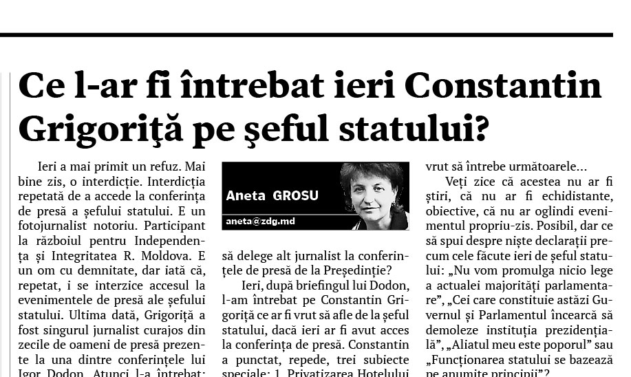 Ieri, după briefingul lui Dodon, l-am întrebat pe Constantin Grigoriţă ce ar fi vrut să afle de la şeful statului, dacă ieri ar fi avut acces la conferinţa de presă. Constantin a punctat, repede, trei subiecte speciale: 1. Privatizarea Hotelului „Codru”, pe când actualul şef al statului era ministru al Economiei; 2. Creditul preferenţial, acordat lui Igor Dodon de Victoriabank, pentru construcţia palatului de la Buiucani; 3. De ce şeful statului, în calitatea sa de comandant suprem al Armatei Naţionale, interzice instruirea şi modernizarea efectivului militar în cadrul unor proiecte internaţionale?