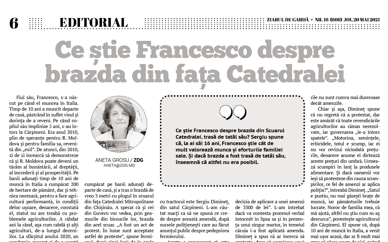 A răbdat ani la rând, așa cum rabdă și alți agricultori, de-a lungul deceniilor. La sfârșitul anului 2020, an pandemic, marcat și de o secetă cumplită, răbdarea lor nu a mai ținut și au ieșit să protesteze. Și-au adus tehnica agricolă în fața Guvernului și au scandat, cerând ajutor statului. La 22 decembrie, obosiți de lipsa de răspuns din partea autorităților, el, fermierul care a muncit timp de 10 ani în Italia, încercând ulterior să facă agricultură performantă în R. Moldova, a urcat în tractorul său, cumpărat pe banii adunați departe de casă, și a tras o brazdă de vreo 3 metri cu plugul în scuarul din fața Catedralei Mitropolitane din Chișinău. A sperat că și cei din Guvern vor vedea, prin geamurile din birourile lor, brazda din acel scuar. „A fost un act de protest. În lume sunt acceptate astfel de proteste”, spune fermierul, după cinci luni de la acele evenimente.