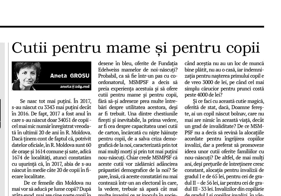 De ce femeile din Moldova nu mai vor să aducă pe lume copii? După atâta exod, mai are cine naşte copii în R. Moldova? Care anume condiţii determină tinerele familii să renunţe la bucuria maternităţii şi a paternităţii? În loc să caute răspunsuri şi soluţii la aceste probleme, Ministerul Sănătăţii, Muncii şi Protecţiei Sociale şi Familiei (MSMPSF) propune, la rang de lege, ca femeilor care se pregătesc să devină mame să li se ofere cutii cu produse igienice şi hăinuţe pentru cei mici. Vă mai amintiţi cutiile albe, cu desene în bleu, oferite de Fundaţia Edelweiss mamelor de noi-născuţi? Probabil, ca să fie într-un pas cu coordonatorul, MSMPSF a decis să preia experienţa acestuia şi să ofere cutii pentru mame şi pentru copii, fără să-şi adreseze prea multe întrebări despre utilitatea acestora, deşi ar fi trebuit. Una dintre chestiunile fireşti şi inevitabile, la prima vedere, ar fi cea despre capacitatea unei cutii de carton, încărcată cu nişte hăinuţe pentru copii, de a salva criza demografică de la noi, caracterizată prin tot mai mulţi morţi şi prin tot mai puţini nou-născuţi. Chiar crede MSMPSF că aceste cutii vor zădărnici adâncirea prăpastiei demografice de la noi? Se pare, însă, că aceste constatări nu mai contează într-un an electoral în care, la vedere, trebuie să apară cât mai multe imagini ce ar inocula în societate prosperitatea.