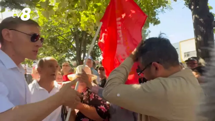 Iar jurnalistul TV8 Andrei Captarenco a fost lovit în cap cu un steag de către un protestatar venit la o nouă ședință de judecată să o susțină pe bașcana Evghenia Guțul.