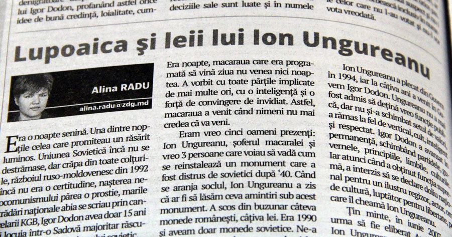 Eram vreo cinci oameni prezenţi: Ion Ungureanu, şoferul macaralei şi vreo 3 persoane care voiau să vadă cum se reinstalează un monument care a fost distrus de sovietici după ‘40. Când se aranja soclul, Ion Ungureanu a zis că ar fi să lăsăm ceva amintiri sub acest monument. A scos din buzunar câteva monede româneşti, câţiva lei. Era 1990 şi aveam doar monede sovietice. Ne-a împărţit tuturor câteva monede şi le-am presărat sub soclu. Era încă URSS, dar cu ministrul Ungureanu puteam discuta şi noaptea despre identitate românească, despre moartea imperiului sovietic, despre libertate, despre libertate, despre libertate.