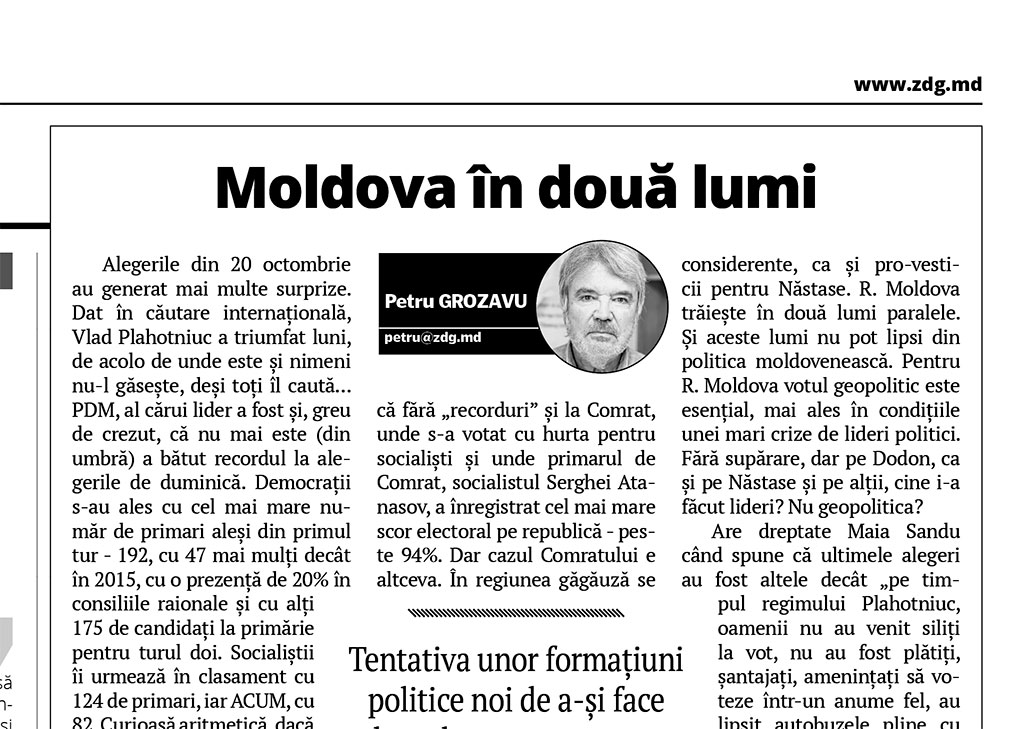 Alegerile din 20 octombrie au generat mai multe surprize. Dat în căutare internaţională, Vlad Plahotniuc a triumfat luni, de acolo de unde este și nimeni nu-l găsește, deși toţi îl caută… PDM, al cărui lider a fost și, greu de crezut, că nu mai este (din umbră) a bătut recordul la alegerile de duminică. Democraţii s-au ales cu cel mai mare număr de primari aleși din primul tur – 192, cu 47 mai mulţi decât în 2015, cu o prezenţă de 20% în consiliile raionale și cu alţi 175 de candidaţi la primărie pentru turul doi. Socialiștii îi urmează în clasament cu 124 de primari, iar ACUM, cu 82. Curioasă aritmetică, dacă ţinem cont că, în urmă cu patru luni, democraţii erau alungaţi de la guvernare, acuzaţi de uzurparea puterii în stat, de corupţie și banditism politic, iar Plahotniuc, pentru a nu repeta soarta lui Vlad Filat, dădea bir cu fugiţii. PDM a fost la un pas de a fi interzis și, în loc să dispară din preferinţele electoratului, se alege cu locul întâi în primul tur. Ce se întâmplă? Au rezervă bună de cadre? Probabil. Aceeași întrebare, ce se în tâmplă?, și pentru Bălţi, unde penalul de Renato Usatîi (și asta-i o altă surpriză), un misionar al serviciilor secrete ruse, câștigă detașat, din primul tur, un al doilea mandat la primărie, cu 64% din voturi, după ce, în mandatul trecut, a lăsat Bălţiul la jumătate de drum și a plecat în Rusia. Ori Orheiul, unde Pavel Verejanu, succesorul altui penal, Ilan Șor, principalul acuzat în dosarul miliardului furat, ajunge primar din primul tur cu peste 78% (și asta-i încă o surpriză, stupidă, dar surpriză). Și de data asta, cu alegerea lui Verejanu, ca și în 2015, cu alegerea lui Șor, condamnat la 7,6 ani de închisoare, întrebarea rămâne: ce se întâmplă la Orhei? E vot corect, vot anomal? Vot provocat de o posibilă anomalie psiho-socială, neîntâlnită până în 2015 în practica electorală din R. Moldova, dar care a prins la moldoveni? Votul orheienilor nu este politic, substratul acestui vot este unul social. Să ne amintim cu ce program electoral a venit Șor în alegeri: că va transforma Orheiul într-un Monaco, un fel de rai social. Din bani furaţi. Doar că, pe orheieni, i-a interesat mai puţin de unde sunt banii. Pentru ei a contat ca Șor să vină cu acești bani la Orhei, să facă drumuri, zone de agrement, terenuri de joacă pentru copii, ceea cu ce i-a cumpărat, probabil, și Verejanu. Nu putea să se treacă fără „recorduri” și la Comrat, unde s-a votat cu hurta pentru socialiști și unde primarul de Comrat, socialistul Serghei Atanasov, a înregistrat cel mai mare scor electoral pe republică – peste 94%. Dar cazul Comratului e altceva. În regiunea găgăuză se operează, de obicei, cu scoruri-standard, practicate la referendumuri și alegeri în Transnistria, Crimeea, Donbas, Abhazia și alte zone, controlate de Rusia. Aici nu se votează după lege, ci conform „cutumelor” electorale locale, cu observatori fictivi, cu mai multe buletine de identitate, pentru mamă, tată, bunici, copii, fraţi, surori sau vecini. Și aici, ca și la Bălţi, Chișinău, Tighina, Taraclia și alte zone urbane, votul este preponderent geopolitic, scorul variind în dependenţă de componenta etnică a localităţilor. Nordul – mai mult pro-Est, Sudul – mai mult pro-românesc și pro-Vest, Centrul 60:40 pro-Vest. A fost și este. R. Moldova, așezată la răscrucea Estului cu Vestul, nu poate exista în afara geopoliticului. Toate apelurile lui Ig. Dodon către partenerii de guvernare, „să facem politică fără geopolitică”, sunt pure aberaţii. Rușii și pro-rușii, l-au votat în 2016 pe Dodon președinte și nu pe Maia Sandu, nu pentru că Dodon e mai bun, ci pentru că Dodon e a lui Putin. Și în 2019, pe socialiști în parlament, la fel. Și pe socialistul Ceban l-au votat la Chișinău, duminică, din aceleași considerente, ca și pro-vesticii pentru Năstase. R. Moldova trăiește în două lumi paralele. Și aceste lumi nu pot lipsi din politica moldovenească. Pentru R. Moldova votul geopolitic este esenţial, mai ales în condiţiile unei mari crize de lideri politici. Fără supărare, dar pe Dodon, ca și pe Năstase și pe alţii, cine i-a făcut lideri? Nu geopolitica?