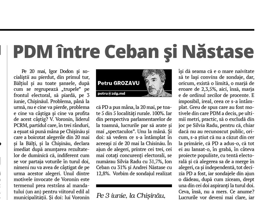 Pe 3 iunie, la Chișinău, vom avea turul doi. Ce va urma? Contează ce interese are PD. Dacă are bătută palma cu Dodon, îl va face primar pe Ceban… Dacă va vrea, însă, să dreagă busuiocul pe relația cu occidentalii (de care are nevoie), îl vor da câștigător pe Năstase, ca să dovedească că nu sunt pe filiera pro-rusă, cu Dodon. Ar mai exista și un alt scenariu, dar nu vreau să cred că s-a ajuns la bani
