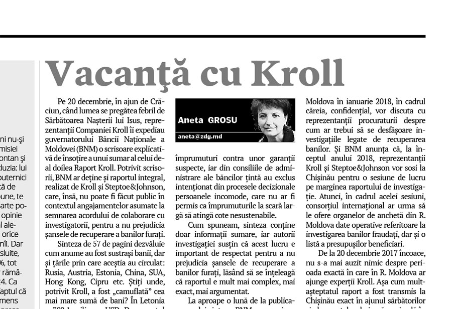 La aproape o lună de la publicarea acelei sinteze, BNM nu a mai revenit cu date şi informaţii, deşi, în comunicatul de presă din 21 decembrie 2017 sublinia că va analiza minuţios cel de-al doilea raport Kroll, în scopul „identificării carenţelor din sistem şi aplicării măsurilor de rigoare”. Vacanţa cu Kroll nu a ajutat BNM să revină cu explicaţii publice pertinente despre ce va urma.