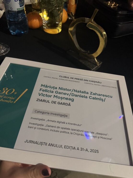 Daniela Calmîș, Felicia Ganev și Victor Moșneag au fost desemnaț jurnaliștii anului pentru investigația Oamenii din spatele operațiunii speciale „diaspora”, în care au arătat cum sute de reprezentanți ai unor concurenți electorali în diasporă au fost racolați din același „Centru de operațiuni”.