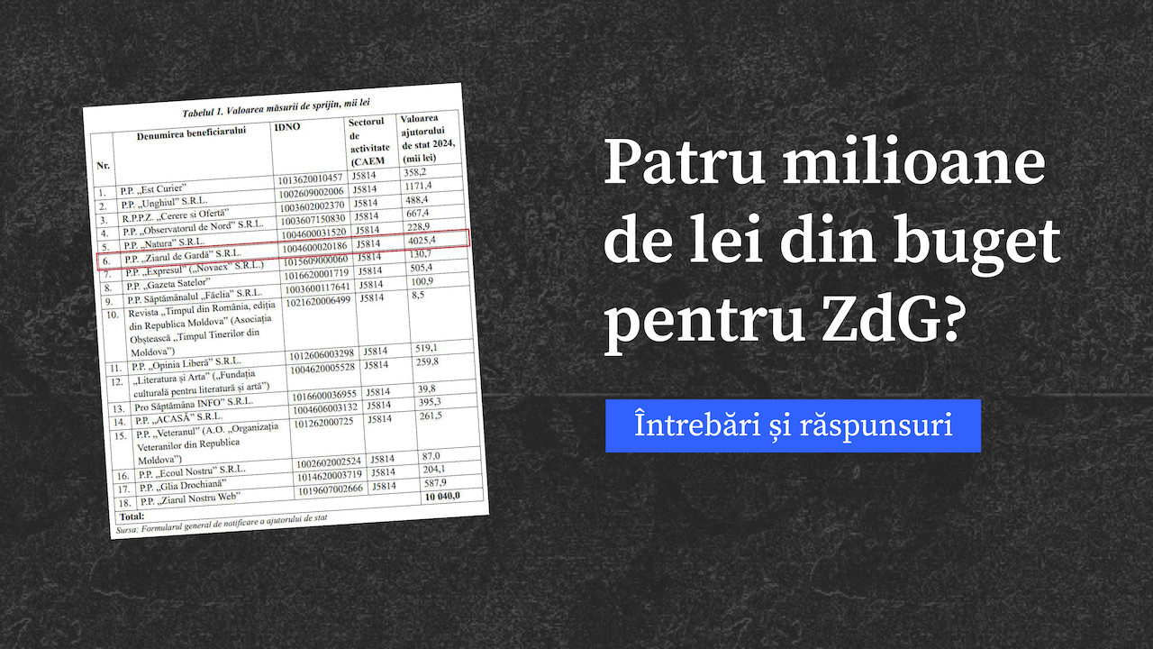 Ziarul de Gardă este singurul ziar de investigații din Republica Moldova și ne bucurăm că cei mai mulți cititori de ziare decid să îl aboneze. În curând dăm start campaniei de abonare pentru anul 2026, iar cetățenii vor decide dacă au nevoie în continuare de această sursă de informare sau nu. Dacă va exista în continuare mecanismul care ajută pensionarii să primească un ziar săptămânal prin acoperirea din buget a taxei de distribuție, vom accepta cu aceeași condiție – să fie transferați banii poștei sau instituției care se ocupă de distribuție. Urmăriți paginile noastre și abonați-i pe cei dragi, e un ziar făcut cu grijă pentru interesul public. Și le mulțumim tuturor pentru critici și întrebări – asta ne ajută foarte mult să rămânem integri și relevanți.