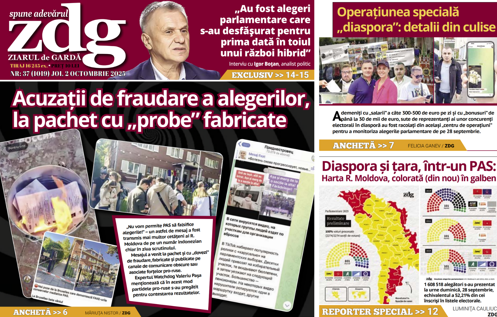 Într-o nouă ediție tipărită a ZdG, aflați cum s-au pregătit partidele pro-ruse pentru contestarea rezultatelor alegerilor parlamentare din 28 septembrie, după ce, în ziua scrutinului, mai multe mesaje cu „dovezi” de fraudare fabricate au fost expediate prin canale de comunicare obscure sau asociate forțelor pro-ruse. Materialul îl găsiți la rubrica Anchetă.