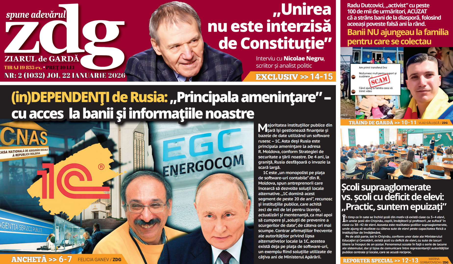 Într-o nouă ediție tipărită a Ziarului de Gardă, aflați că majoritatea instituțiilor publice din țară își gestionează finanțele și bazele de date utilizând un software rusesc – 1C. Mai mult, Ucraina a interzis utilizarea acestui program în instituțiile publice, invocând riscuri pentru securitatea națională. Cum justifică instituțiile statului utilizarea programului rusesc și ce alternative există pe piața de software aflați în rubrica Anchetă.