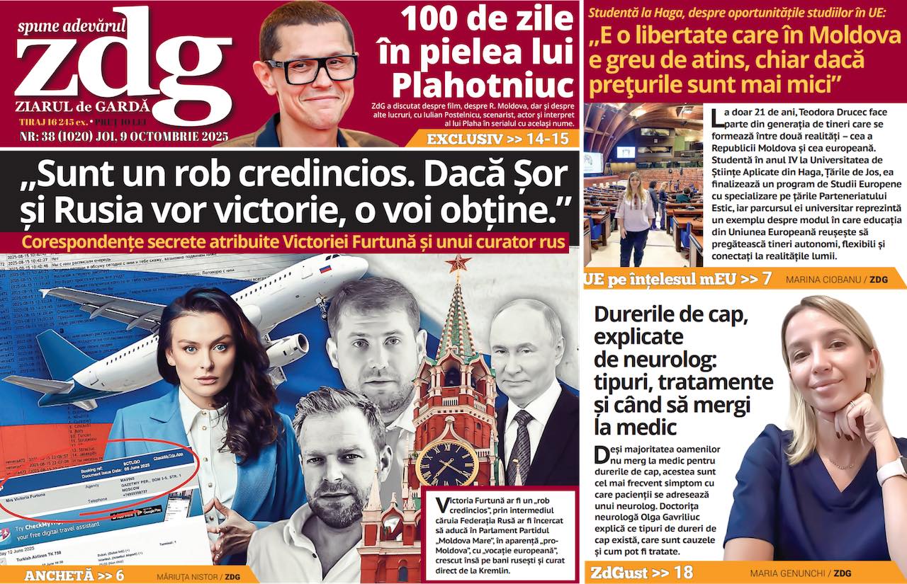 În cea de-a 38-a ediție tipărită, ZdG a analizat documentele scurse în spațiul public, atribuite Victoriei Furtună și unui curator din Federația Rusă. Ce documente se regăsesc în scurgerea de date, cum ar fi încercat Federația Rusă, prin intermediul Victoriei Furtună, să aducă în Parlament un partid cu „vocație europeană” și cum ar fi urmărit aceasta să influențeze justiția prin intermediul unor oameni din sistemul penitenciar, aflați în rubrica Anchetă.