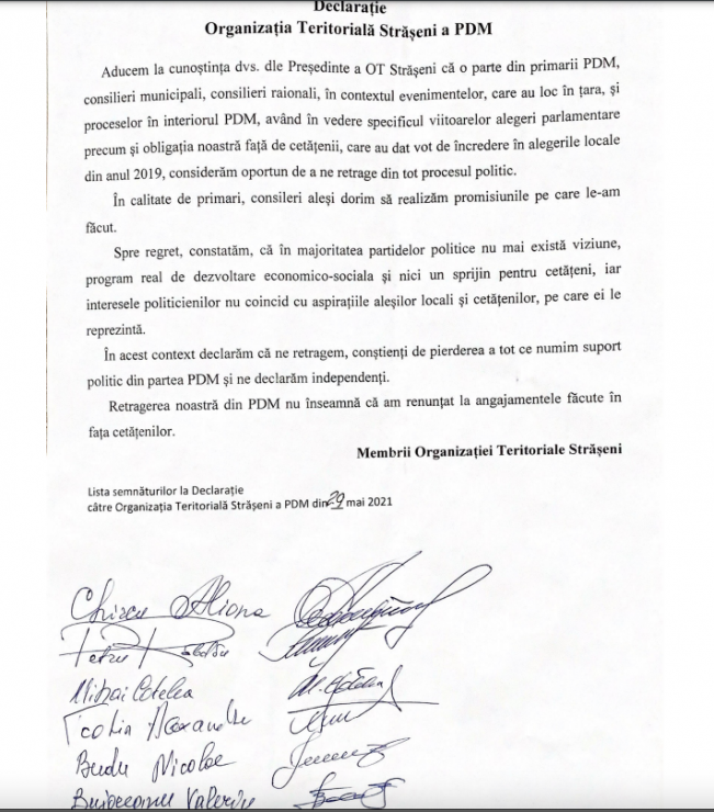 „Aducem la cunoștința dvs. dle Preşedinte a OT Străseni că o parte din primarii PDM, consilieri municipali, consilieri raionali, în contextul evenimentelor, care au loc în țara, și proceselor în interiorul PDM, având în vedere specificul viitoarelor alegeri parlamentare precum și obligația noastră față de cetățenii, care au dat vot de încredere în alegerile locale din anul 2019, considerăm oportun de a ne retrage din tot procesul politic. În calitate de primari, consileri aleşi dorim să realizăm promisiunile pe care le-am făcut.
