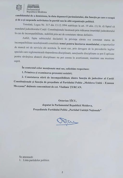 „Cerem demisia judecătorului Vladimir Țurcanu de la Curtea Constituțională. Judecătorului Curții Constituționale Vladimir Țurcan trebuie să-i fie ridicată imunitatea și să fie demis din funcție. Într-un stat de drept este inadmisibilă situația ca un judecător la Curtea Constituțională să fie și președinte a unui partid politic. Acest judecător a ignorat în mod grosolan toate normele de drept, iar pentru acest fapt trebuie să răspundă. Cerem Autorității Naționale de Integritate să examineze în regim prioritar această sesizare și să constate incompatibilitatea acestor funcții”, menționează Țîcu.