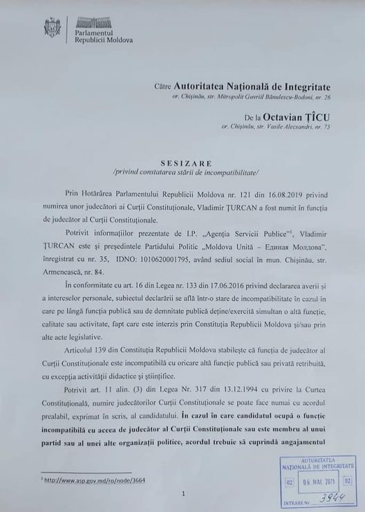 Deputatul neafiliat Octavian Țîcu anunță că a depus joi, 6 mai, o sesizare la Autoritatea Națională de Integritate (ANI) prin care solicită ridicarea imunității și demiterea din funcție a judecătorului Curții Constituționale (CC) Vladimir Țurcan. În textul sesizării, Țîcu invocă incompatibilitate de funcție, întrucât, pe lângă funcția de magistrat al CC, potrivit lui Țîcu, Țurcan ar deține funcția de președinte al partidului politic „Moldova Unită – Единая Молдова”.