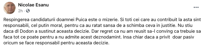 „Respingerea candidaturii doamnei Puică este o mizerie. Și toți cei care au contribuit la asta sunt responsabili, cel puțin moral, pentru că au ratat șansa de a schimba ceva în justiție. Nu știu dacă dl Dodon a susținut această decizie. Dar regret că nu am reușit să-l conving că trebuie să facă tot ce poate pentru a nu admite acest deznodământ. Însă chiar dacă a privit doar pasiv, oricum se face responsabil pentru această decizie”, a scris Nicoale Eșanu.