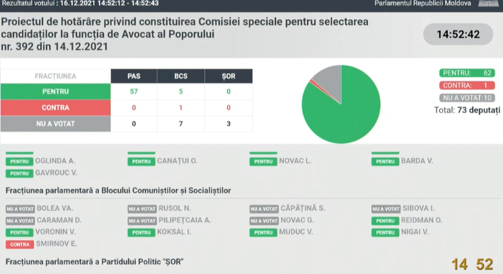 Parlamentul a constituit joi, 16 decembrie, Comisia specială pentru selectarea candidaților la funcția de Avocat al Poporului. Astfel, din comisie fac parte deputații ai fracțiunii Partidul Acțiune și Solidaritate (PAS), ai Blocului Comuniștilor și Socialiștilor (BCS) și un reprezentant al Partidului ȘOR.
