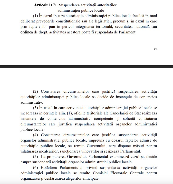 Totuși, articolul 171 din proiect a stârnit reacții și critici. Articolul 171 prevede că activitatea autorităților administrației publice locale poate fi suspendată de Parlament dacă acestea „încalcă în mod deliberat prevederile constituționale sau ale legislației” ori dacă „pun în pericol integritatea teritorială, securitatea națională sau ordinea de drept”.