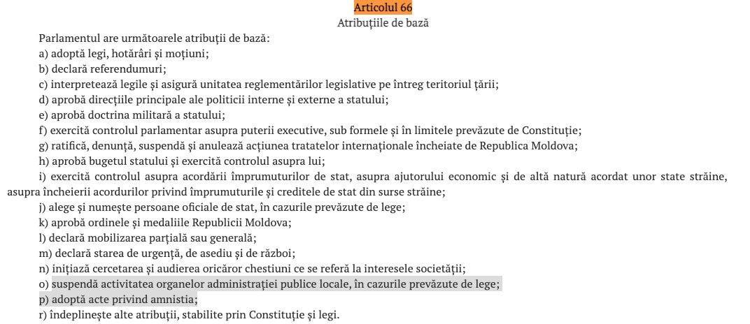 „Proiectul a fost elaborat foarte mulți ani, începând cu 2012 lucrează Secretariatul. Articolul 171 face parte din capitolul care transpune atribuțiile de bază ale Parlamentului din Constituția R. Moldova. Acolo este indicată expres această prevedere, este virgula și scris «în condițiile legii». (…) Acolo trebuie să fie întrunite niște condiții extreme ca să se aplice această normă. Niciun alt interes nu este, pur și simplu este una dintre atribuțiile Parlamentului conform Constituției”, a punctat deputata.