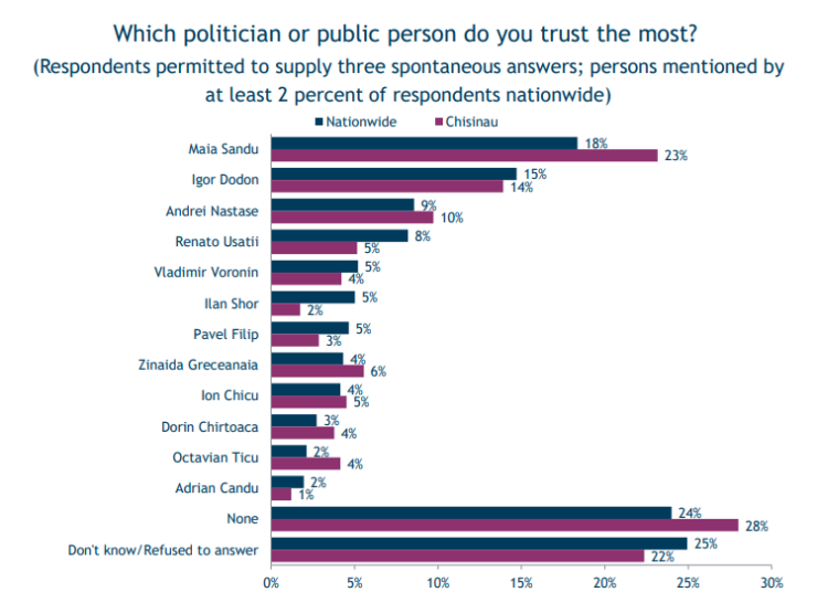 În același timp, la nivel național, Andrei Năstase acumulează 9%, Renato Usatîi – 8% și Vladimir Voronin, Ilan Șor și Pavel Filip – câte 5%, în condițiile în care 24% dintre respondenți nu au numit niciun politician, iar 25% au menționat că nu știu sau au refuzat să răspundă.
