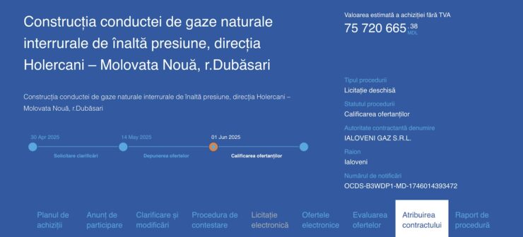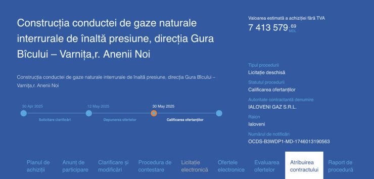 Instituția a menționat că procedurile de achiziție pentru selectarea antreprenorilor la executarea lucrărilor de construcție pentru obiectele „Gazoductul interrural s. Gura Bîcului – s. Varnița” și „Gazoductul interrural s. Holercani – s. Molovata Nouă” au fost finalizate cu desemnarea câștigătorilor.