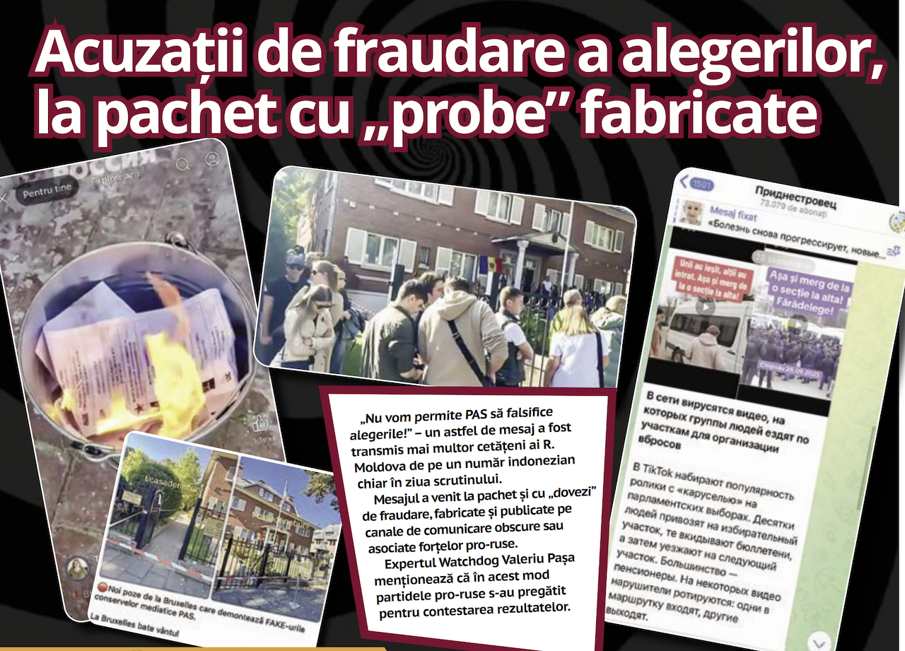 După ce, două zile la rând, cetățenii R. Moldova au fost atenționați în privința unei potențiale fraudări a votului de către autorități, pe care autorii mesajelor o prezintă drept certitudine, în ziua scrutinului au apărut și „dovezile” de fraudare, fabricate și publicate pe canale de comunicare obscure sau asociate forțelor pro-ruse. mr