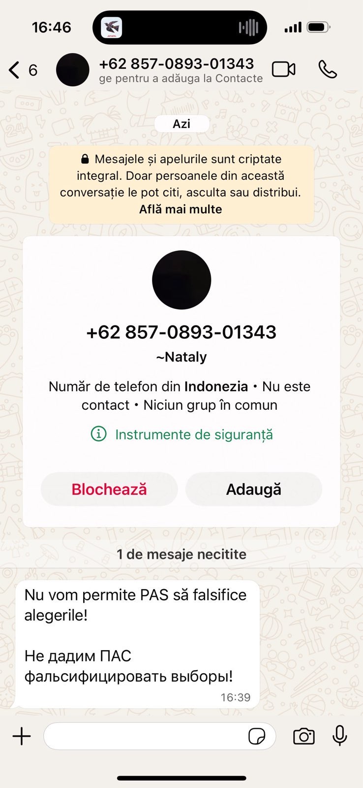 A doua zi, pe 28 septembrie 2025, chiar în plin proces electoral, tot de pe un număr indonezian, cetățenii R. Moldova au primit un nou mesaj: „Nu vom permite PAS să falsifice alegerile!”
