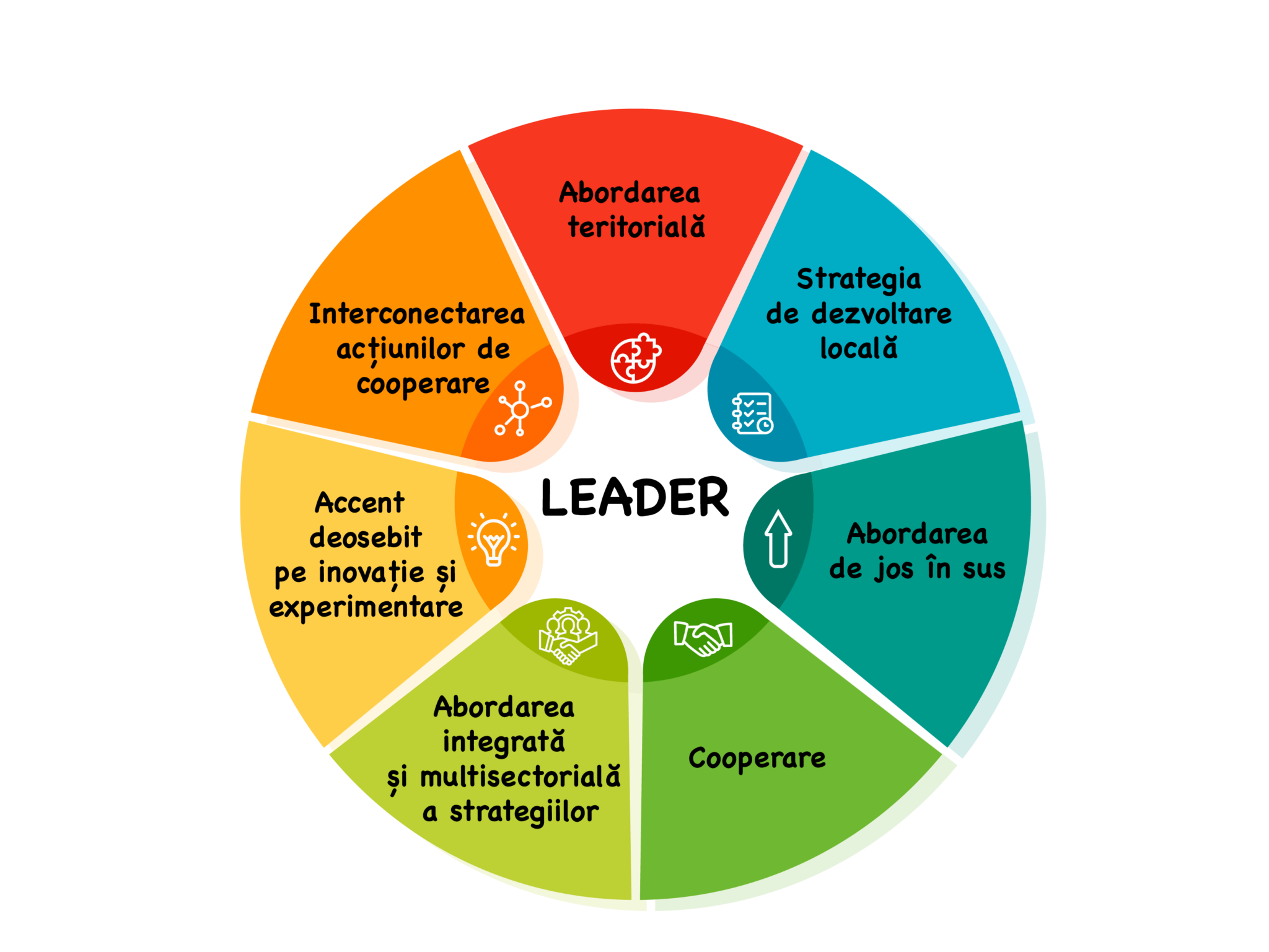 Pe de altă parte, Abordare LEADER este un acronim din limba franceză – „Liaison Entre Actions de Développement de l’Économie Rurale”. În traducere ar fi „legături între acțiuni pentru dezvoltarea economiei rurale”. Abordarea LEADER este o metodă de dezvoltare a comunităților din zonele rurale, care implică actorii locali în elaborarea și implementarea strategiilor de dezvoltare locală și care funcționează în baza următoarelor principii: abordare teritorială, parteneriate locale, abordare „de jos în sus”, acțiuni integrate și multisectoriale, inovație, colaborare în rețea și cooperare.