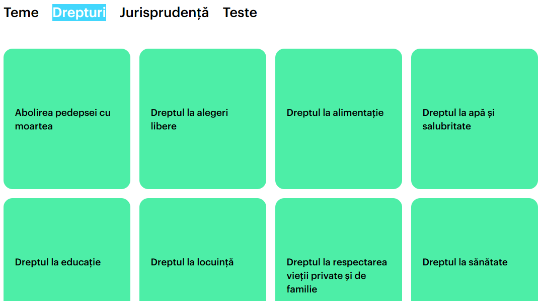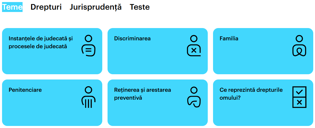În prezent, Ghidul privind Drepturile Omului pentru Moldova acoperă 10 subiecte, 20 de drepturi și mai multe teste tematice pentru verificarea cunoștințelor despre drepturile omului. Aflați cum funcționează drepturile omului în contextul situațiilor cotidiene: