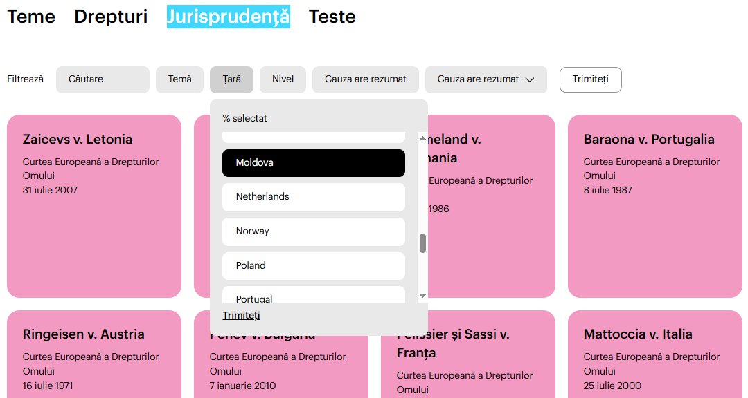 De asemenea, puteți fi interesat de jurisprudență, atunci puteți studia cauze privind Republica Moldova sau alte țări citate în Ghid, provenite din instanțele naționale, sau din jurisprudența Curții Europene a Drepturilor Omului sau a Comitetului ONU pentru Drepturile Omului.