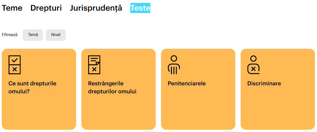 Dacă doriți să utilizați Ghidul în scopuri educaționale sau pentru a vă evalua cunoștințele despre drepturile omului înainte sau după studierea tematicelor prezentate în Ghid, puteți îndeplini teste pe diverse teme din Ghidul privind Drepturile Omului pentru Moldova.