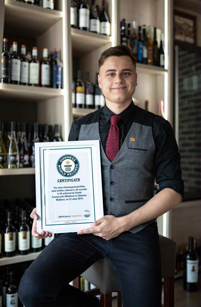 În 2019, având un an de experiență ca somelier, Daniel a reușit să intre în Cartea Recordurilor. „Mi-am dat seama de o chestie foarte interesantă despre R. Moldova – discriminarea de vârstă, care, din păcate, încă există. A fost piedica care mi-a creat dificultăți. Am mai înțeles că poți fi un specialist bun, să ai cunoștințe extraordinar de mari, dar dacă nu ești cunoscut, n-au niciun rol.” Tânărul a analizat recordurile din cartea Guinness și a ales tehnica sabrage – deschiderea la viteză a sticlelor de șampanie cu sabia.