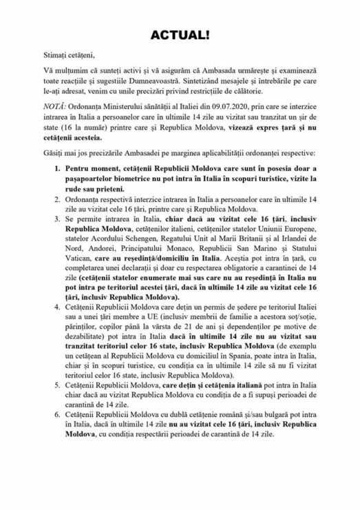 Представители Посольства Республики Молдова в Италии отмечают в обновленной информационной справке от 4 августа, что граждане Молдовы, у которых есть только биометрический паспорт, не могут въезжать в Италию в целях туризма, визитов к родственникам или друзьям. В то же время граждане Молдовы, у которых есть вид на жительство, могут въезжать в Италию, только если за последние 14 дней не пересекали Молдову.