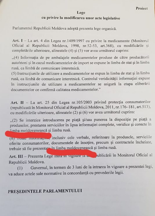 Согласно проекту, вся информация о лекарственных препаратах или об услугах, предлагаемых потребителю, должна также сообщаться вербально на «молдавском» и русском языках.