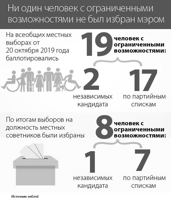На местных выборах этого года, только 19 человек с ограниченными возможностями баллотировались на должность местного советника. Согласно отчету «Мониторинг всеобщих местных выборов от 20 октября 2019 года с точки зрения интеграции лиц с ограниченными возможностями», выполненному экспертом Виктором Король для Восточноевропейского фонда в Молдове, все кандидаты – это лица с ограниченными опорно-двигательными возможностями, 7 из которых являются пользователями инвалидных колясок. Воодушевляет тот факт, что в этом году 13 человек с ограниченными возможностями впервые баллотировались на выборах.