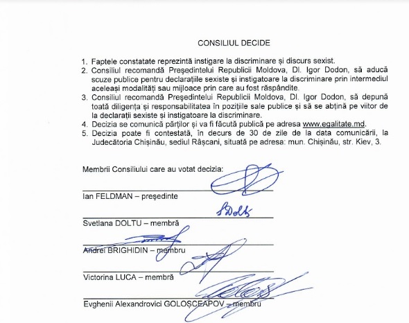 - Совет рекомендует Президенту Республики Молдова г-ну Игорю Додону публично извиниться за сексизм и подстрекательство к заявлениям о дискриминации теми же методами или средствами, которыми они были распространены.