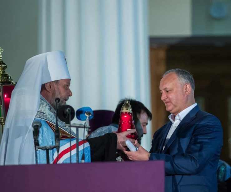 С импровизированной сцены перед Собором, митрополит Владимир, а также президент Республики Модова Игорь Додон поздравили граждан, после чего раздали Благодатный огонь.