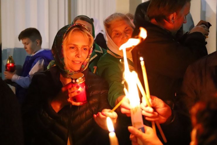 ФОТО Благодатный огонь раздали верующим, собравшимся перед столичным Собором