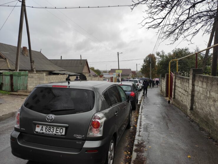 Помимо толпы людей, десятки машин с приднестровскими номерами стоят колонной возле избирательных участков.