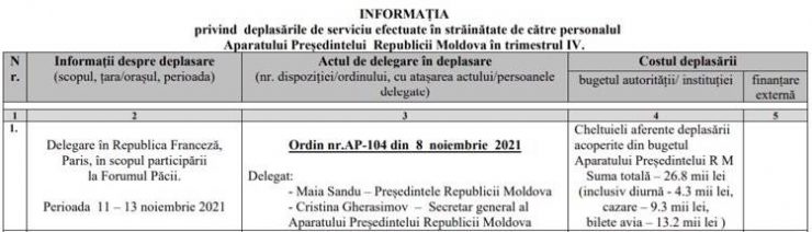 На визит во Францию было потрачено 26,8 тысячи леев, в том числе, суточные – 4,3 тысячи леев, авиабилеты – 13,2 тысячи леев, проживание – 9,3 тысячи леев, а в состав делегации входили Президент Республики Молдова Майя Санду и Генеральный секретарь Администрации президента Республики Молдова Кристина Герасимова.