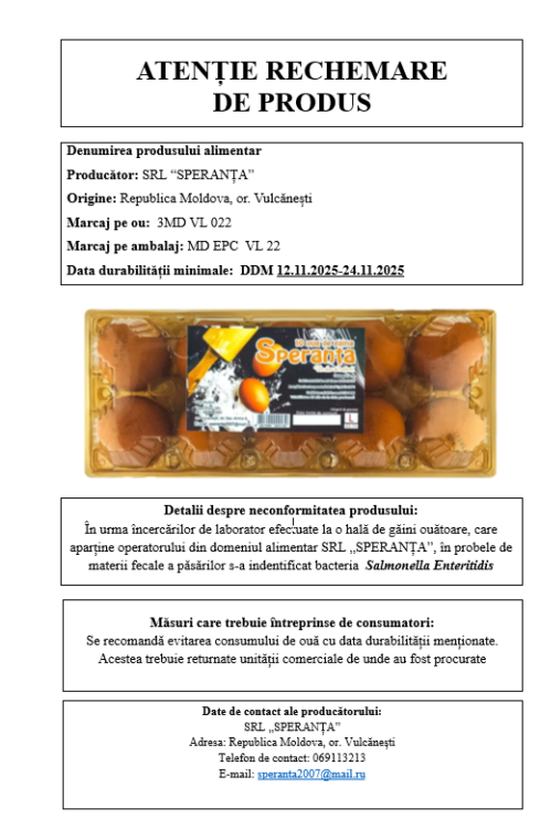 Национальное агентство по безопасности пищевых продуктов (ANSA) информирует потребителей о намерении экономического оператора ООО «SPERANȚA» изъять с рынка и отозвать пищевой продукт — куриные яйца для потребления человеком.
