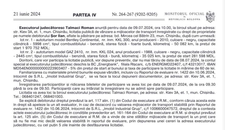 В первом случае речь идет об автомобиле Bentley Continental, который зарегистрирован на праве собственности за должником Шором Иланом, а стартовая цена составляет почти 2 млн леев — 1 970 752 лея.
