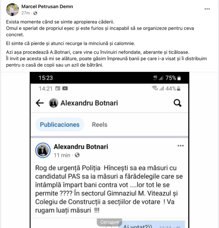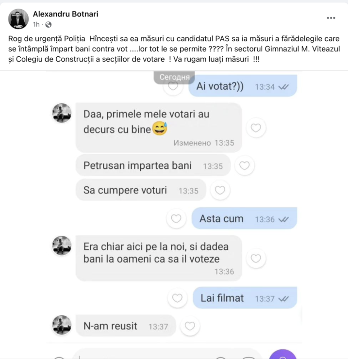 Александру Ботнарь, мэр города Хынчешть, освобожденный от должности, в сообщении на своей странице в Facebook просит полицию «принять меры», поскольку, по его словам, «кандидат от ПДС раздает деньги за голоса…». Ботнарь также разместил скриншот, на котором два человека обсуждают процесс голосования, причем один из них пишет, что «Петрушан делится деньгами, чтобы купить голоса».