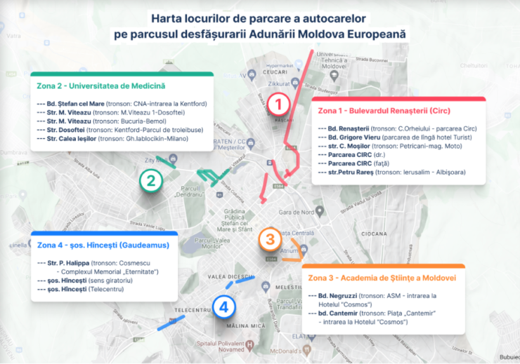 Карту парковок можно найти на сайте moldovaeuropeana.md. Есть четыре основные зоны парковки в зависимости от въезда в город. (…) Правительство продолжает работать с Министерством внутренних дел над обеспечением беспрепятственного движения транспорта в это воскресенье, чтобы граждане, желающие попасть на митинг, могли сделать это без препятствий. Общественный транспорт в Кишиневе будет ходить как обычно, за исключением того, что для мероприятия будет зарезервирована площадь Великого Национального собрания. 21 мая количество единиц общественного транспорта в Кишиневе и его пригородах будет увеличено», — пояснил Артур Мижа, генеральный секретарь правительства и председатель организационной группы собрания «Европейская Молдова».