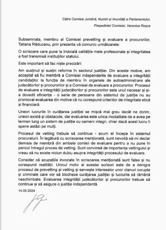 Несколько часов спустя депутат PAS Вероника Рошка, которая также является председателем парламентской комиссии по юридическим вопросам, назначениям и иммунитету, сообщила, что «Комиссия по юридическим вопросам, назначениям и иммунитетам получила заявление об отставке из двух комиссий от Татьяны Рэдукану. Как бы сильно они ни выступали против коррупции в системе, процесс оценки добросовестности прокуроров и судей будет продолжаться», приложив письмо, подписанное Татьяной Рэдукану.
